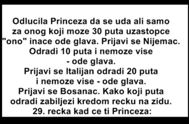 Odlučila princeza da se uda, ali samo za onog koji može 30 puta zaredom, inače ode glava. Prijavi se Nijemac, odradi 10 puta i ne može više, pa mu skinoše [ … ]
