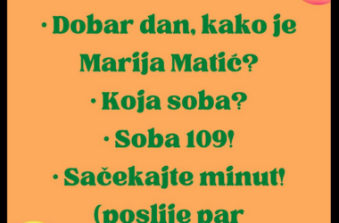 Baka zove bolnicu: • Dobar dan, kako je Marija Matić? • Koja soba? • Soba 109! • Sačekajte minut! (poslije par minuta) Sestra kaže da je dobro, biće puštena u [ … ]