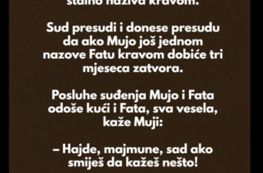 Tužila Fata Muju da je Mujo stalno naziva kravom. Sud presudi i donese presudu da ako Mujo još jednom nazove Fatu kravom dobiće tri mjeseca zatvora. Posluhe suđenja Mujo i [ … ]