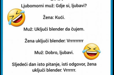 Ljubomorni muž: Gdje si, ljubavi? Žena: Kući. Muž: Uključi blender da čujem. Žena uključi blender: Vrrrrrrrrr Muž: Dobro, ljubavi. Sljedeći dan isto pitanje, isti odgovor, žena uključi blender: Vrrrrrr. Treći [ … ]